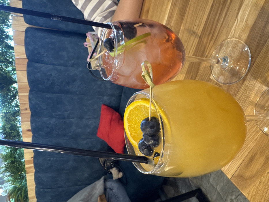 The scene, located within an indoor establishment in Dmitrov, Russia, features two stemmed glasses containing beverages, positioned on a light wooden plank table. The glass on the left holds a yellow-orange liquid with ice, garnished with an orange slice and three blueberries skewered on a wooden pick, and includes a black straw. The glass on the right contains a reddish-pink liquid with ice, garnished with a lime wedge and one dark berry skewered on a wooden pick, also with a black straw. In the background, a dark blue upholstered banquette with vertical tufting is visible, supporting a red cushion on the left. Partial views of two individuals are present: one on the left wearing blue jeans and a light top, and another on the right wearing a striped shirt. Above the banquette, a wooden slatted wall panel precedes artificial green foliage interspersed with small lights.