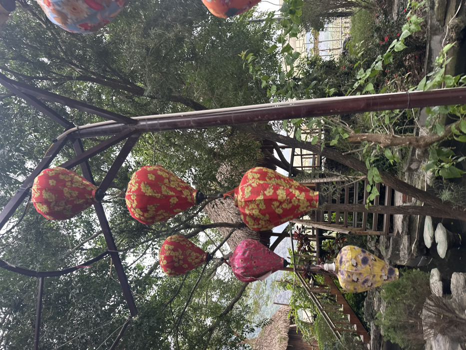 The image depicts an outdoor environment in Hoa Lư Ward, Vietnam, characterized by suspended lanterns and lush vegetation