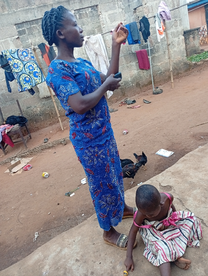 A woman in a blue floral outfit stands on a concrete surface, gesturing with her right hand while holding a phone in her left. A young child sits on the ground beside her, playing with a small yellow object. A black chicken stands in the dirt behind them. A clothesline with hanging garments stretches across the background, and a weathered concrete building stands further back. Discarded cans and debris litter the ground.