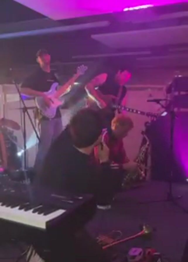 A band is performing on a stage with purple lighting. The band consists of a bass player, guitarist, drummer, keyboardist, and saxophonist. The keyboardist is sitting at his keyboard, and the saxophonist is squatting down, adjusting his instrument. The other band members are standing and playing their instruments. There are various pieces of equipment scattered around the stage.