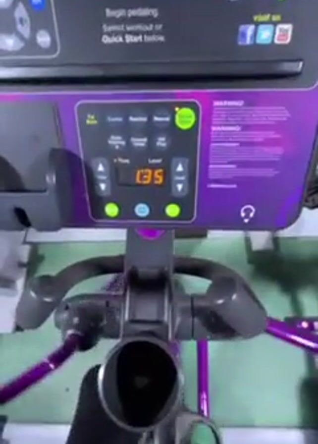 first-person perspective of someone using a stationary bicycle. The bike is purple and gray, and the person is wearing black pants and green shoes. The timer on the display of the bike shows the time spent pedaling. The display also has other options, such as level, calories and resistance. The screen above the display reads, "Begin pedaling. Select workout or Quick Start below" and also has social media icons. The environment appears to be inside of a gym.