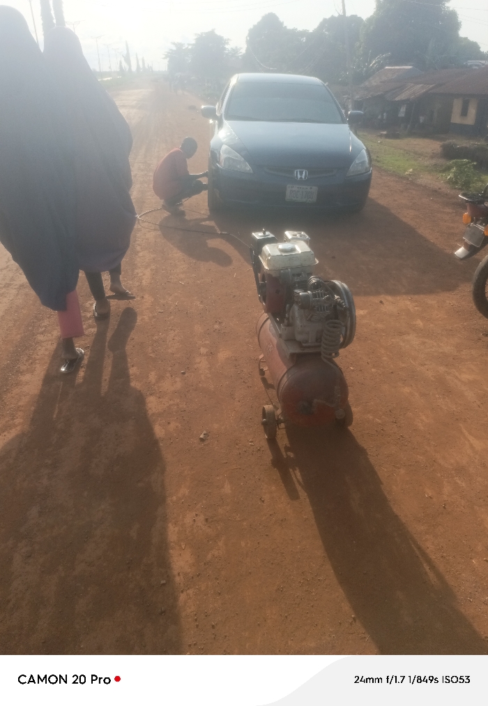 - "The scene depicts a roadside tire inflation operation on an unpaved, reddish-brown dirt road in Markurdi, Nigeria" by FM-dR4Vw2, licensed under CC BY 4.0