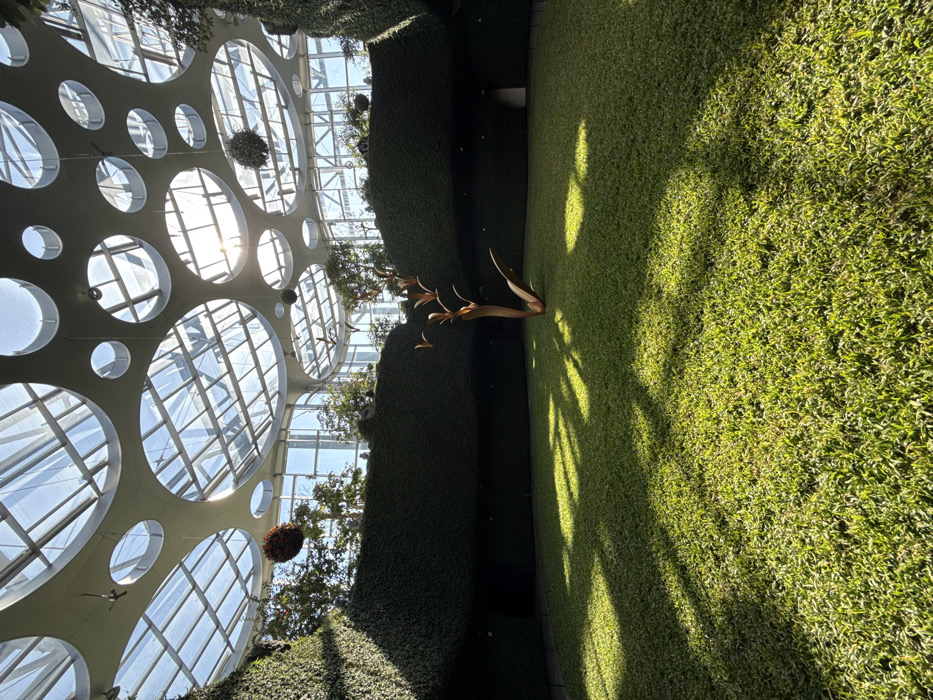 The image displays an expansive, brightly illuminated indoor-outdoor rooftop garden or atrium located within the TX Huaihai building in Shanghai, China. The scene is dominated by a meticulously maintained, vibrant green grass lawn covering the ground plane. Tall, densely packed, dark green manicured hedges form the perimeter walls of the central grass area, creating a consistent, deep green backdrop. The overhead structure consists of a complex pattern of numerous circular and semi-circular glass skylights of varying diameters, integrated into a light-colored, possibly metallic, framework. Direct natural sunlight streams through these skylights, casting distinct patterns of bright illumination and sharp shadows across the green lawn, particularly in the foreground and around a central sculpture. In the mid-ground, positioned slightly right of center, stands a solitary, abstract sculpture. This metallic object exhibits a bronze or coppery hue, featuring upward-curving, stylized leaf or petal-like forms emanating from a central stem. The sculpture casts a visible, elongated shadow on the grass. Several spherical decorative elements are suspended from the ceiling structure. One reddish, floral-patterned ball hangs on the far left, and a grey-green, moss-like sphere is visible on the far right. Through the transparent sections of the ceiling and beyond the hedges, glimpses of exterior trees and distant urban structures are observable. No individuals are present in the depicted scene.