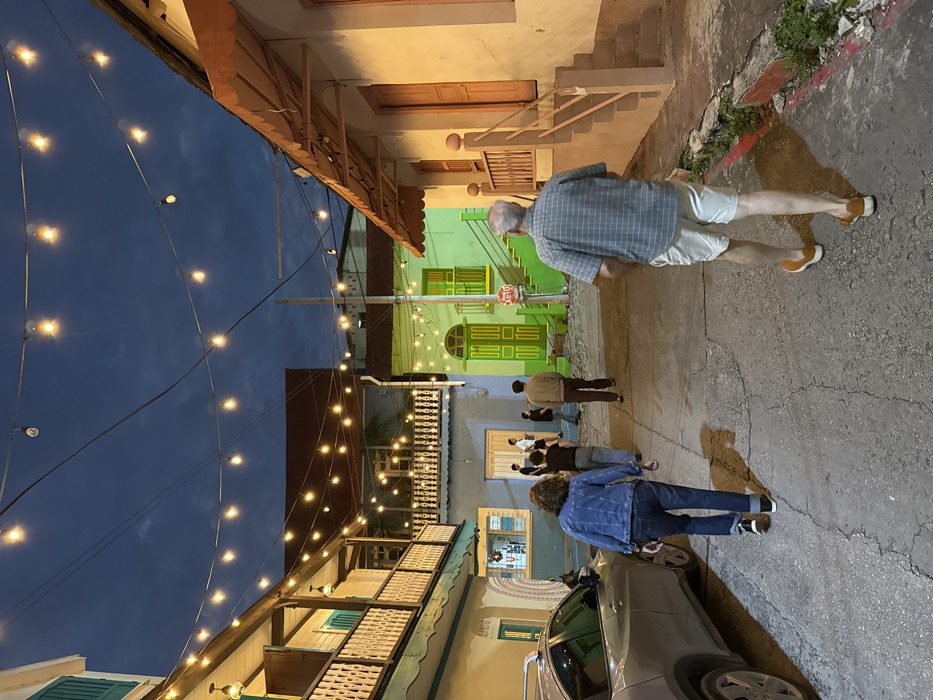 A street scene at dusk features string lights overhead. Buildings line the street, painted in various bright colors. Several people walk along the sidewalk, and a car is parked on the right side. An elderly man walks in the opposite direction of the other people. The pavement shows cracks and imperfections.