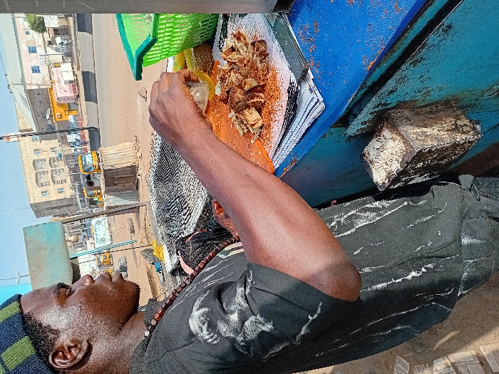 An adult male stands in profile at an outdoor food stall in Rijiyar Zaki, Nigeria, preparing food
