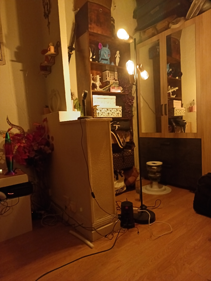 A dimly lit interior shows a room with various items. To the left, a lava lamp and flowers sit on a surface. A room divider stands nearby. A tall bookshelf is filled with boxes and decorative objects. A floor lamp with exposed bulbs illuminates the area. In the background, a wardrobe with mirrored doors is partially visible. The floor is covered with a network of electrical cords.
