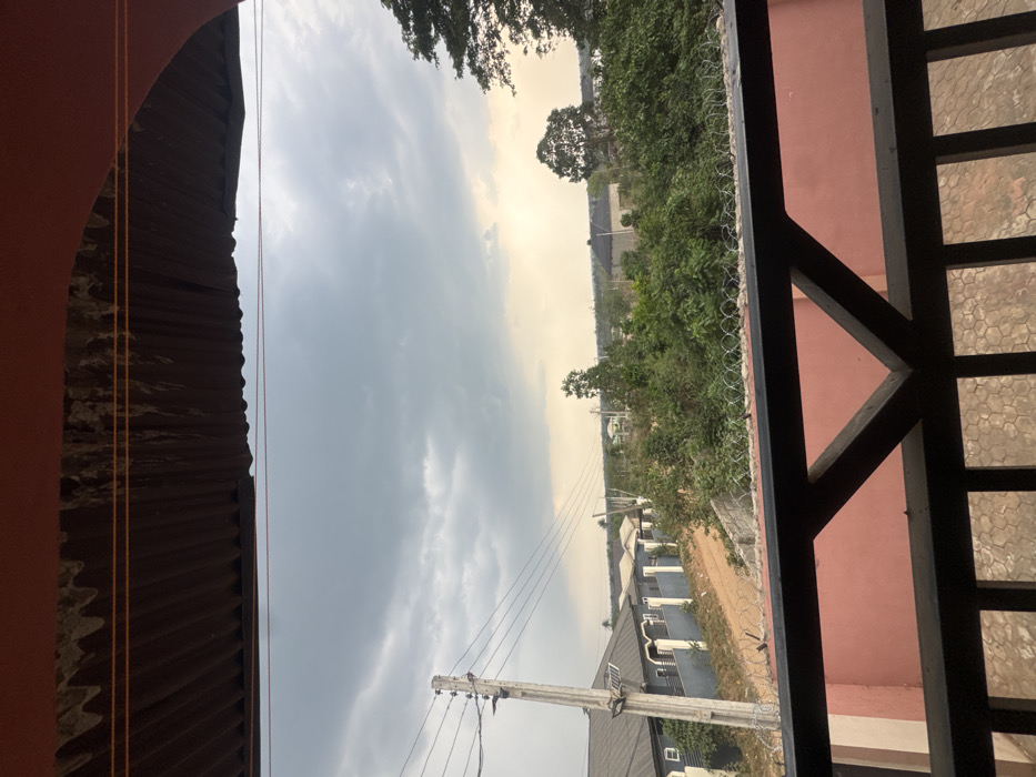 The image depicts a panoramic view of a residential area in Gbongan, Nigeria, captured from an elevated position, likely a balcony. The foreground features the underside of a dark, corrugated metal roof above, with two parallel orange wires stretched horizontally beneath it. Below the main visual field, a dark metal balcony railing with a repeating triangular and rectangular pattern is visible. Immediately behind the railing, a segment of a pinkish-red wall is present, topped with a line of barbed or razor wire. The midground reveals a sloped dirt road on the left, flanked by several single-story residential buildings with grey roofs and light-colored walls, some secured by perimeter fences. A prominent light-colored utility pole with multiple overhead power lines stands vertically on the left. The central and right midground are dominated by dense, green vegetation, including numerous trees and bushes. The background extends to a distant horizon line, where more scattered structures are visible amidst further vegetation. The sky is largely overcast, filled with varying shades of grey clouds, and exhibits a lighter, hazy band near the horizon on the right, suggesting a low sun or specific atmospheric conditions. No individuals or discernible actions are present in the scene.