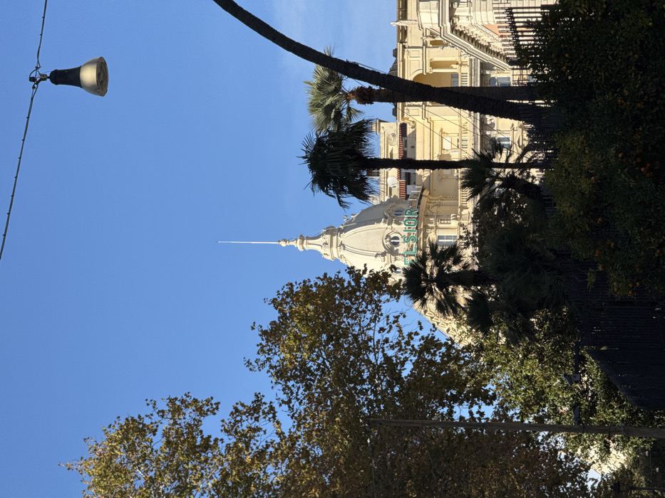 The image depicts a detailed view of the Hotel Excelsior Rome, located on Via Vittorio Veneto, Rome, Italy. The scene is observed under a clear blue sky. In the upper center and right, the Hotel Excelsior Rome stands prominently. It is a large, multi-story building with a cream or light yellow facade and ornate architectural details, including balconies and intricate stonework. A large, light-colored dome with a spired finial crowns a section of the building. Below the dome, a green sign with the word "EXCELSIOR" is visible. The foreground and midground are characterized by dense foliage. On the left, a deciduous tree with yellowish-green leaves occupies a significant portion, partially obscuring the building. Several dark-trunked palm trees are scattered throughout the midground and right, their fronds visible against the building and sky. Below these, a lower layer of darker green shrubs and trees, some bearing small orange fruits (suggesting citrus trees), can be seen, partially obscured by a dark metal fence in the lower midground. Overhead, a dark wire or cable stretches horizontally across the top of the frame, from which a single bell-shaped street lamp, light in color, hangs on the right side. No individuals or discernible actions are present within the frame. The lighting suggests a bright, sunny day, with the building illuminated and some foreground foliage appearing in shadow.