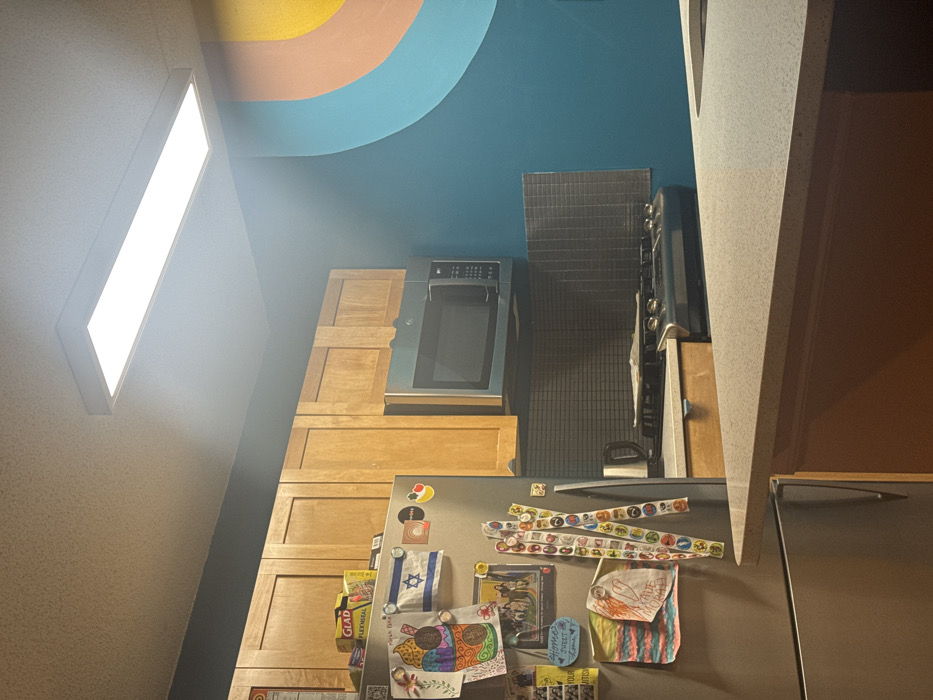 A kitchen features light wood cabinets stacked to the ceiling, topped by a microwave and oven. A stainless steel refrigerator is covered with artwork and magnets. The walls are a combination of light beige and blue, with a colorful circular design on the ceiling. A rectangular light fixture illuminates the scene. Dark tiles line the backsplash behind the stove.
