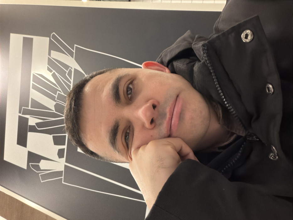A close-up selfie captures a man resting his face on his hand. He has short, dark hair and light skin, with a black jacket visible. A graphic art print depicting what appears to be stylized french fries is in the background. The man's expression is neutral, and the overall lighting appears to be from an indoor source. The image is slightly rotated, with the subject appearing to be positioned at an angle.