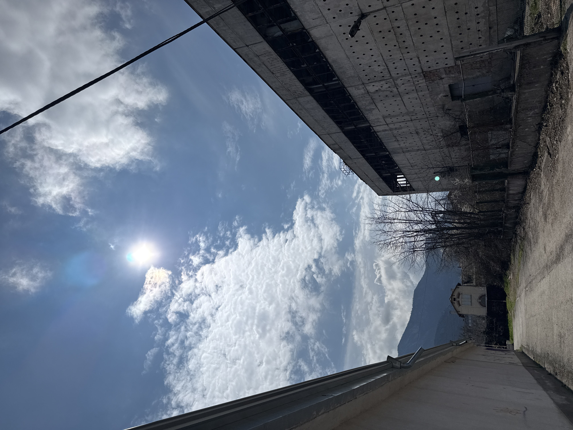 The image depicts an upward-angled view of a partly cloudy sky with a bright sun, a large concrete structure, a street, and a building in Vratsa, Bulgaria. The concrete structure, possibly an abandoned industrial building, is characterized by its rectangular shape, numerous holes, and a dark underbelly. A powerline cuts across the top left corner of the frame. The street is concrete and appears to be slightly damaged, with some vegetation growing along its edge. The building in the distance, possibly residential, is visible between bare trees and a mountain. The lower part of the frame shows a white concrete wall with a gray gutter.