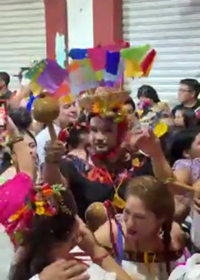 crowded celebration in what appears to be a public space with a red and white building in the background. People are dancing and celebrating, many dressed in traditional clothing. One person is prominently wearing a large, elaborate headdress decorated with flowers and colorful flags. Many people are holding and shaking maracas. The scene is lively and festive, with confetti in the air.