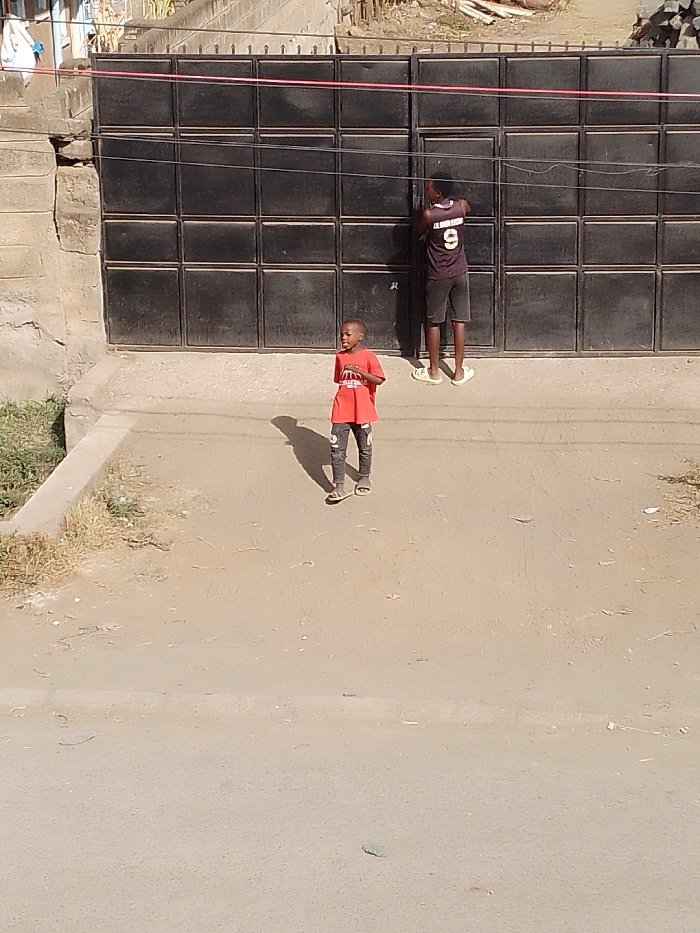 The image depicts an outdoor scene in London ward, Kenya, under bright daylight. A large, dark, multi-paneled metal gate is centrally positioned in the background, set on a raised concrete platform. Several thin, horizontal red lines or cables are strung across the face of the gate. To the right of the gate, an individual, appearing to be an adult or older youth, with dark skin, wearing a dark short-sleeved top with a white "9" and text on the back, dark shorts, and white sandals, stands facing away from the viewer, with hands raised towards the upper section of the gate. In the mid-ground, a young child with dark skin, wearing a red short-sleeved t-shirt with a white graphic, dark patterned trousers, and light-colored sandals, stands facing left with a slight smile. A prominent shadow from the child extends to their left on the light brown, unpaved ground that comprises the foreground and mid-ground. Dry, sparse vegetation is visible along the left edge of the concrete platform. Multiple thin, dark electrical or communication cables span horizontally across the upper frame of the image.