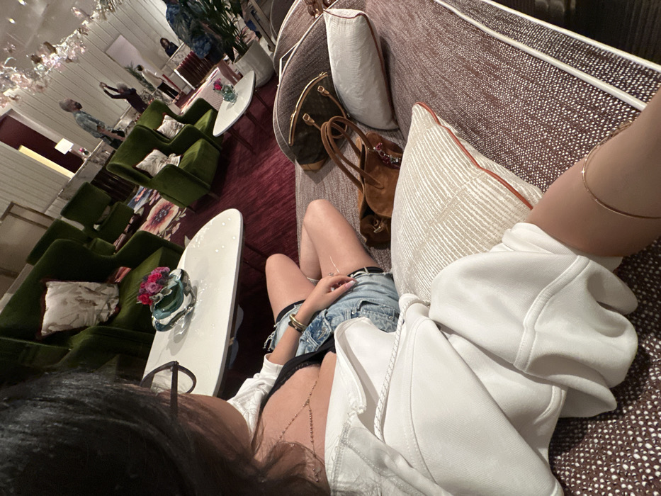 The image portrays an interior scene of a luxurious lounge or lobby in Las Vegas, United States. In the foreground, an individual with dark hair, wearing clear-framed glasses, a white hoodie, a black top, and light blue denim shorts, is seated on a brown textured sofa with legs crossed. A delicate gold-colored necklace, a gold-colored bracelet on the right wrist, and a ring on the left hand are visible. Two handbags rest on the sofa to the right of the individual's legs: a brown Louis Vuitton Monogram Speedy-style bag and a smaller brown suede bag with a decorative charm. In the midground, a white oval coffee table displays a distinct blue and green glass vase containing an arrangement of pink and red flowers. Beyond this table, multiple dark green velvet high-backed armchairs are arranged on a patterned rug featuring shades of red and floral motifs. The background shows additional green armchairs and several indistinct figures of other patrons. A male figure with a beard is standing near a counter or reception desk. Overhead, decorative chandeliers with clear, crystal-like elements are visible. The environment is illuminated by dim, warm ambient lighting, suggesting an evening setting within a high-end establishment.