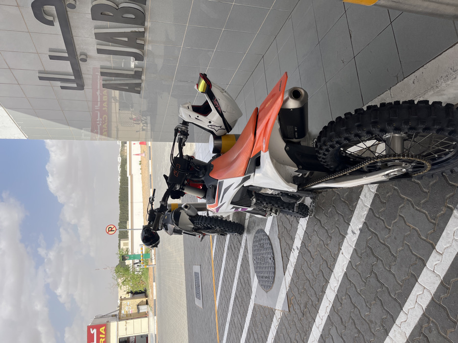 A motorcycle is parked on a paved surface with white diagonal stripes. The bike has an orange and white seat and a black exhaust pipe. A white helmet with red and yellow accents rests on the seat. The bike is positioned near a building with the name "AL JABAR" on it. A parking sign is visible in the background along with a blue sky.