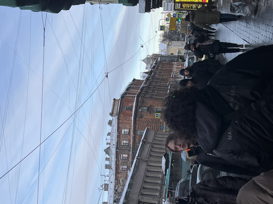 This image depicts a winter street scene in Saint Petersburg, Russia, observed from a low angle, looking down a city street lined with historic buildings. The sky is a light blue with subtle horizontal cloud patterns, traversed by numerous dark overhead utility and trolleybus wires. In the foreground, the back of a person with dark, curly hair is prominent, wearing a black jacket with partial text reading "MARA MIRACLES" and a black shoulder bag strap. To their left, a young individual with long, straight brown hair and a dark, fur-hooded winter jacket faces slightly right. The street is bustling with pedestrians dressed in winter coats, hats, and scarves. On the right side of the image, individuals walk away from the camera on a wet or slushy sidewalk. One woman in a dark coat and beanie is visible in the mid-ground, and further back, a person in an olive-green coat walks away. The urban environment features multi-story buildings on both sides of the street. On the left, a light-colored building with multiple windows displays Cyrillic text, partially obscured. Adjacent to it, a prominent red-brown brick building with ornate architectural details and numerous windows stands out, its ledges and roof partially covered in snow and adorned with visible icicles. Another older building with snow-covered rooftops is visible further down the street. On the immediate right, a building with a green lower facade hosts commercial signs, one partially readable as "ШАУРМА" (Shawarma) in Cyrillic, with a green traffic light visible above it. The street itself appears to have parked and moving vehicles. A green city bus or trolleybus is visible on the left side of the road, and multiple cars, mostly dark-colored, are present. Yellow pedestrian crossing signs are mounted on poles along the street. The ground shows evidence of snow or slush, reflecting light in places.