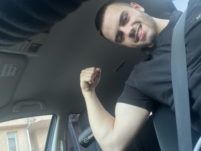 - "A young adult male with short dark hair and a light beard is pictured in the driver's seat of a Mazda vehicle, smiling broadly at the camera" by FM-eqcVx2, licensed under CC BY 4.0