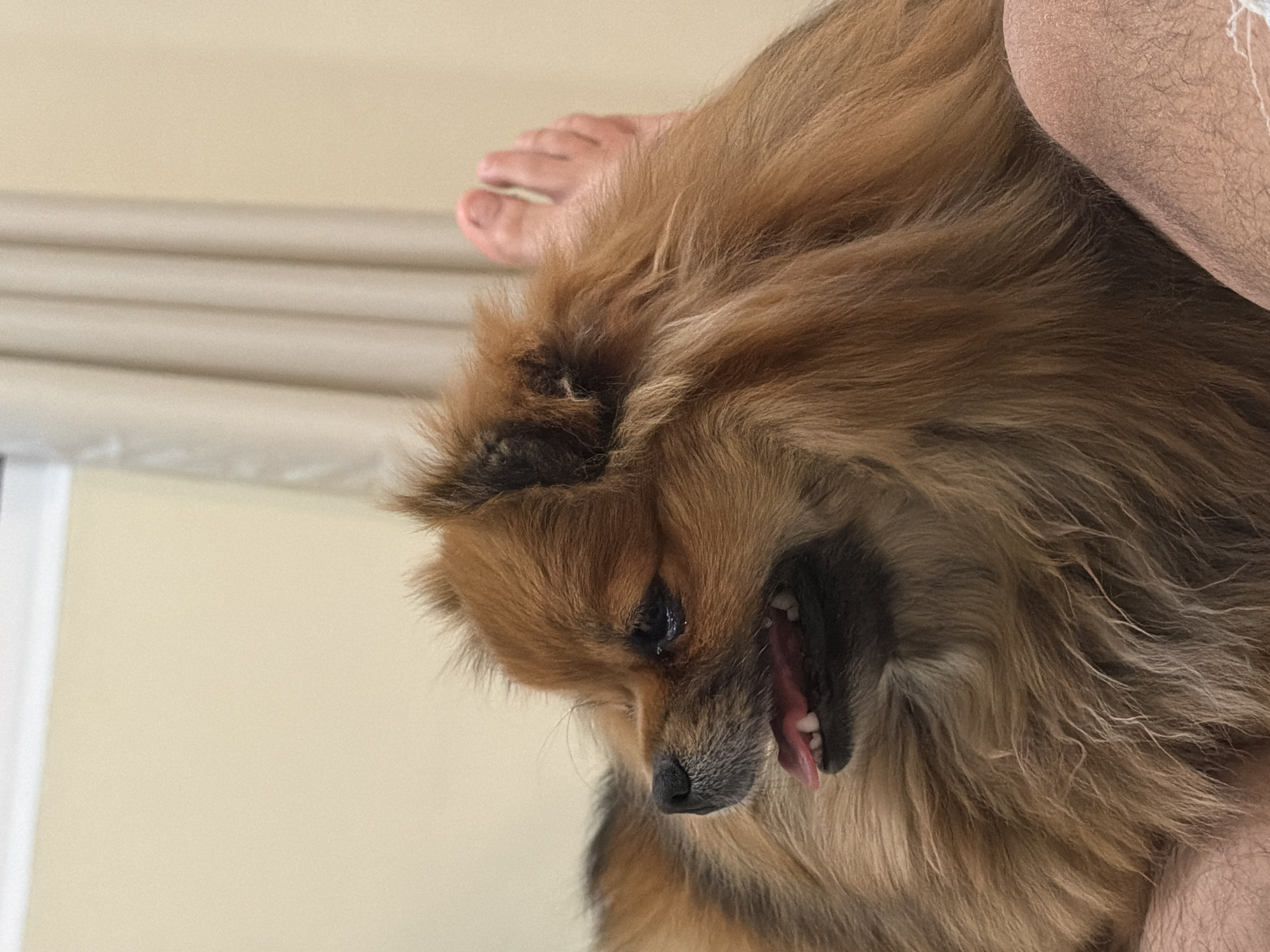 - "A close-up, low-angle shot reveals a panting, brown, long-haired dog lying on its back" by FM-HG5o13, licensed under CC BY 4.0