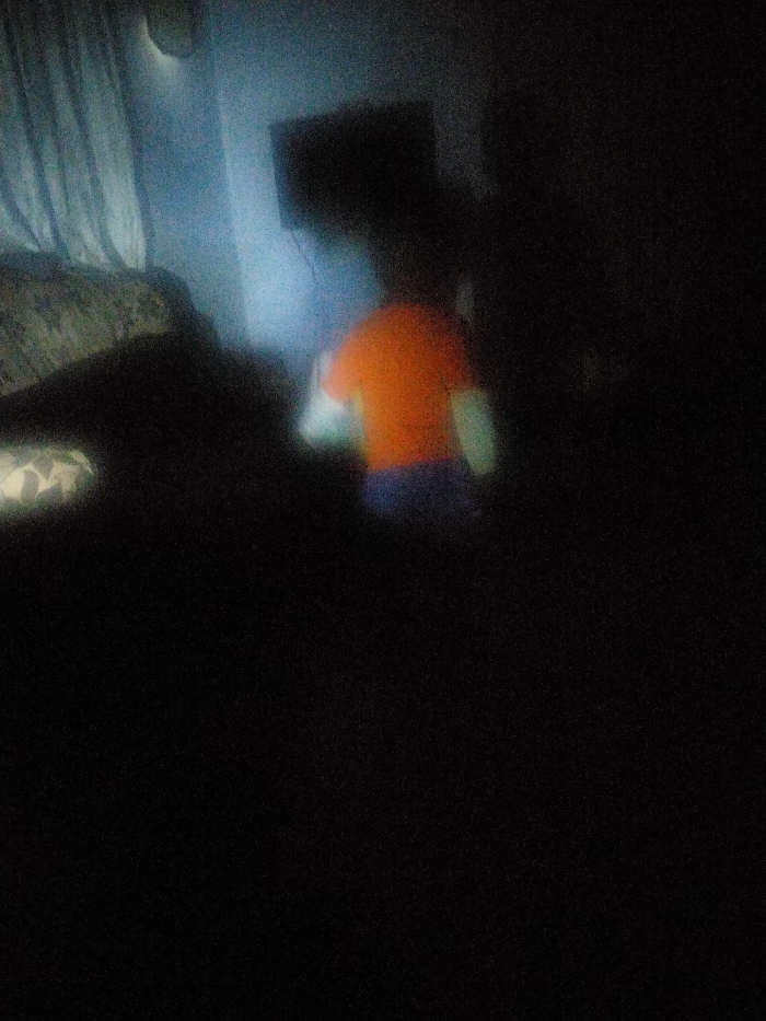 A blurry, dimly lit interior shows a child wearing an orange shirt and blue shorts standing facing a wall
