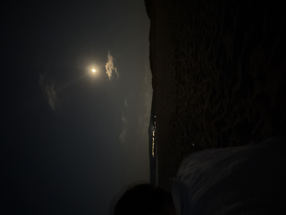 The image depicts a nocturnal scene on a sandy beach in Dyuni, Bulgaria. In the upper right quadrant, a bright, near-full moon is prominently visible, casting significant illumination. Several small, scattered clouds are present in the dark sky, with one cloud positioned directly below the moon. Faint stars are discernible in the upper left portion of the sky. In the lower-left foreground, the blurred upper back and the dark, indistinct head of an individual, viewed from behind, are present. The individual appears to be wearing a light-colored upper garment. The immediate foreground consists of dark, textured sand. The sandy expanse of the beach extends into the midground, appearing dark under the night sky. In the distant background, a horizontal line of artificial lights is visible, illuminating a section of a low-lying landmass or hills. The silhouette of these hills or dunes can be observed against the horizon, illuminated by both the moon and the distant lights. No explicit actions or interactions are depicted.
