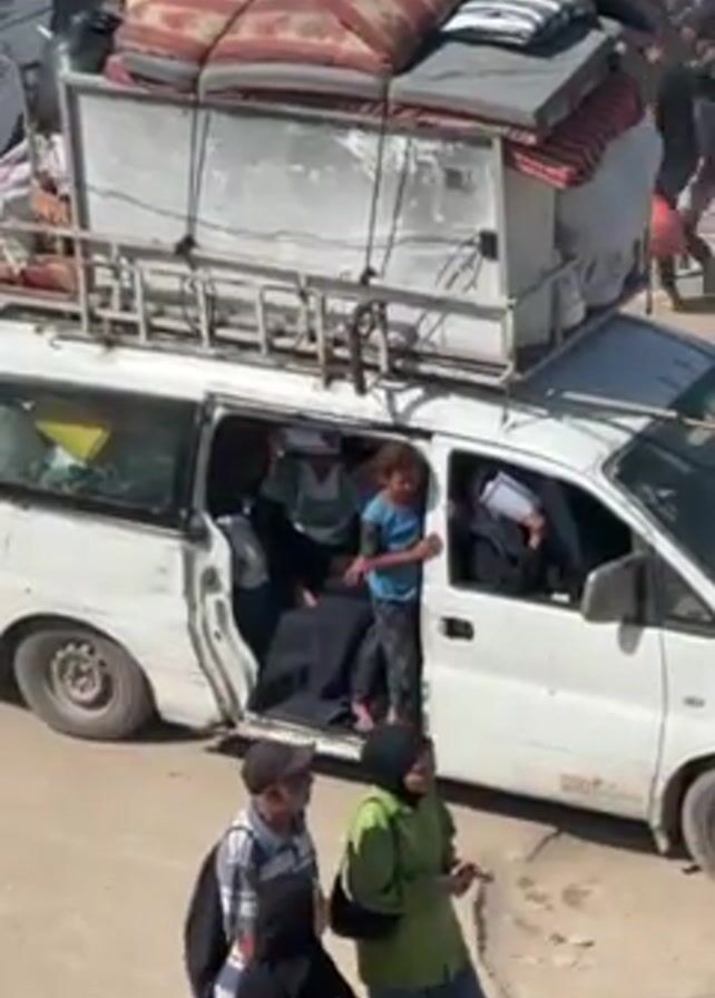 dilapidated white minivan, packed with passengers, parked on the side of a dusty road. The vehicle is overloaded with mattresses and other goods strapped to its roof. An open sliding door reveals a young girl standing in the doorway, alongside several other passengers sitting inside. One passenger is holding up a document. Two adults walk in front of the van, seemingly unrelated to the group inside. The overall impression is one of poverty and displacement. The environment appears to be a densely populated area.