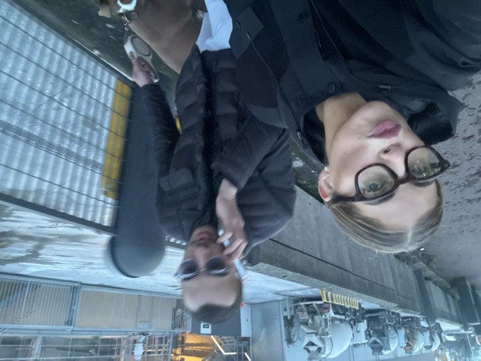 Two individuals pose in an off-kilter selfie. The woman, wearing dark-rimmed glasses and a black jacket, is positioned on the right. To her left stands a man in sunglasses and a puffer jacket, holding a dog leash attached to a light brown dog. They appear to be on a walkway featuring metal grates and yellow safety lines. Several white machines are visible in the background.