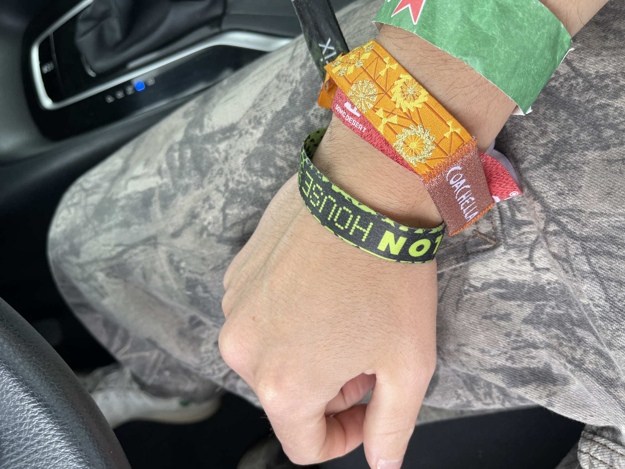 A close-up shot depicts a person's hand and wrist adorned with multiple wristbands, including ones for Coachella and Sonic Desert, while in a vehicle