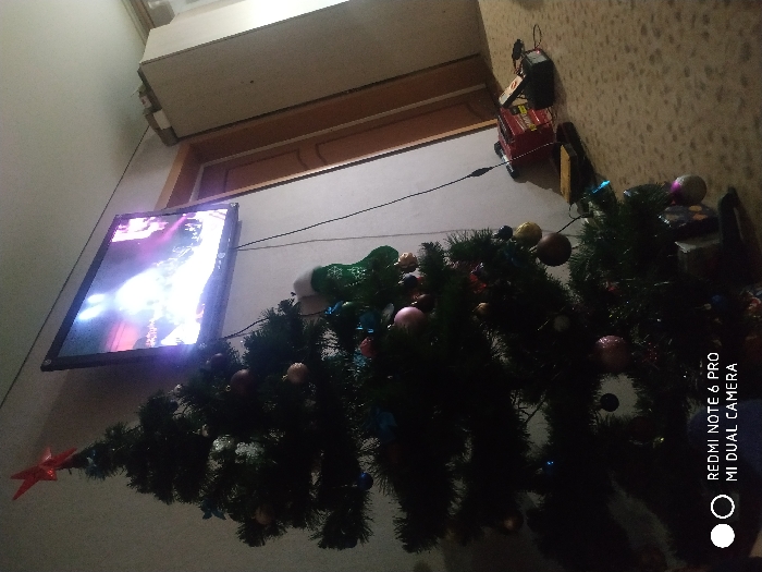 The scene depicts an indoor domestic environment, specifically a room in the city of Chaikovsky, Russia. A dark green artificial Christmas tree, adorned with various colored baubles and topped with a red five-pointed star, occupies the left foreground and midground. A green Christmas stocking with white trim is partially visible hanging from the tree on the right side. Above and slightly to the right of the tree, a flat-screen television is mounted on a light-colored wall. The television screen displays bright, illuminated imagery, possibly a concert or stage performance, with prominent white and purple light effects. To the right of the television, a light-colored wooden door frame is visible, leading to an unseen area. Further to the right, a tall, light-colored wardrobe or cabinet stands against the wall, with an unidentified light-colored object placed on its top. The floor is covered with a light-colored, patterned carpet or linoleum. On the floor in the midground, near the base of the wall, a red, rectangular object (possibly a toolbox or a portable heater) and a black electronic device are present, accompanied by visible cables running along the wall and floor. No individuals are present in the image. The lighting is dim, primarily originating from the television screen and ambient sources, consistent with an interior setting during low light conditions. The bottom left of the image displays a "REDMI NOTE 6 PRO MI DUAL CAMERA" watermark.
