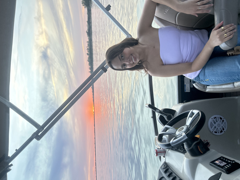 A young woman sits in the captain's chair of a boat, wearing a strapless lavender top and jeans. She is smiling, and her hands are adorned with rings. The boat's steering wheel and dashboard are visible. In the background, there is a calm body of water reflecting a colorful sunset, and trees line the distant shore. The boat's metal frame is also present in the image.