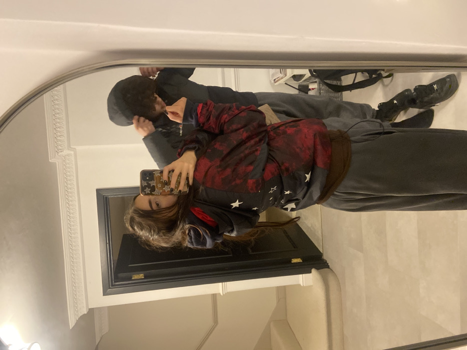 An interior location in Welwyn Hatfield, UK, is depicted through a mirror reflection. The image shows two individuals in what appears to be a residential hallway. In the foreground, a female with long, dark brown hair is holding a smartphone with a star-patterned case, using it to capture her reflection. She wears dark nail polish, a dark blue and red tie-dye hoodie with white stars on the left side, a brown top underneath, and dark grey sweatpants. Behind her, a male figure with curly dark hair is adjusting the hood of a dark grey puffer jacket. He wears dark grey sweatpants and black sneakers. The environment reflected includes light-colored walls, white decorative cornice molding on the ceiling, a light fixture in the upper left, and a dark-colored doorframe with a partially open door to the left, revealing a light-colored room and a carpeted staircase beyond. The floor is light grey. To the right of the male, a white piece of furniture and a black backpack are visible.