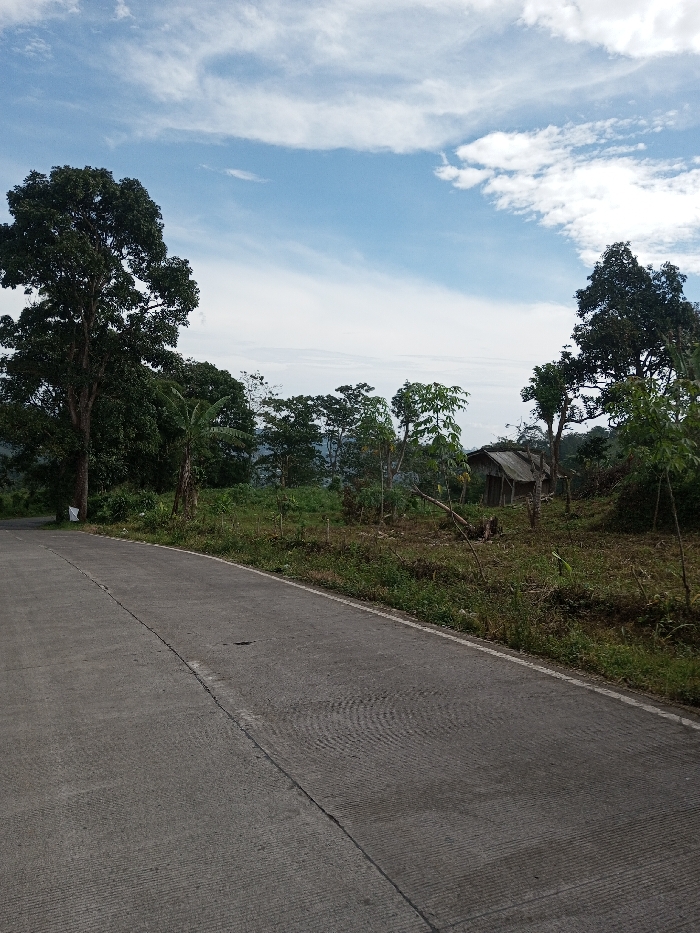 This image captures an outdoor rural landscape in Ariyalai, Sri Lanka, under a bright blue sky with scattered white cirrus and stratocumulus clouds. The foreground features a two-lane grey concrete road, exhibiting transverse texture lines and a distinct central seam, curving gently to the left. A white line delineates the right edge of the road. Adjacent to the road on the right is an uneven terrain covered with green grass, shrubs, and various young trees, some areas appearing recently cleared or cultivated. On the far left, a tall, mature tree with a dense canopy of dark green leaves stands beside the road, with a small white marker or object partially visible at its base. Further into the mid-ground, slightly right of center, a small, dilapidated wooden structure with a dark, sloped roof is present, partially obscured by surrounding vegetation. Other smaller trees and a banana plant are interspersed throughout the mid-ground. The background is dominated by a dense line of trees, suggesting a forested or hilly horizon. No individuals, animals, or active interactions are visible in the scene.