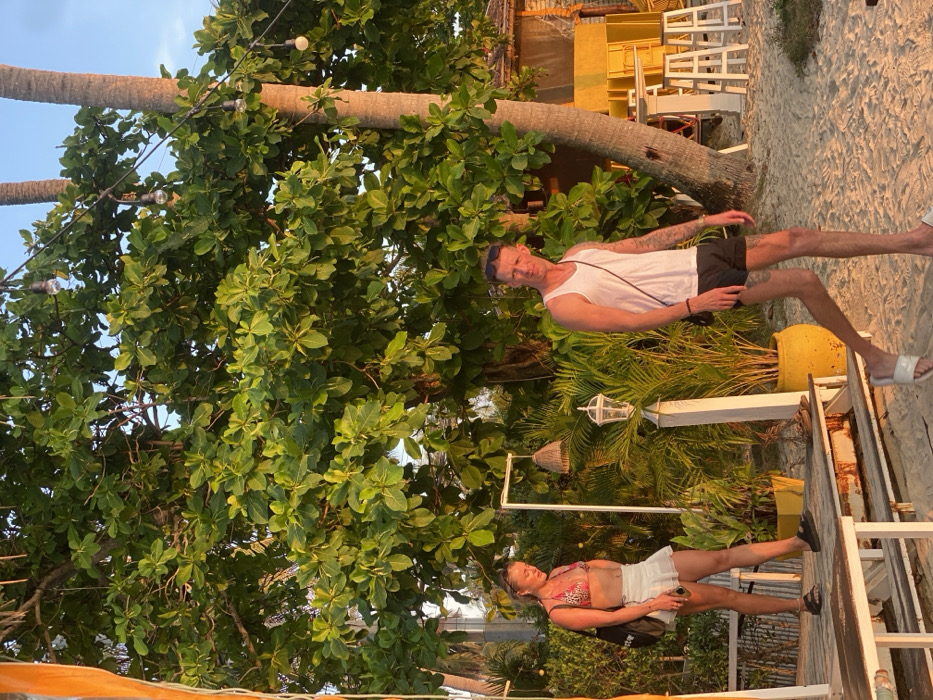 This image depicts an outdoor scene in Baan Sri Thanu, Thailand, captured during late afternoon or early evening light. Two Caucasian individuals are present in the foreground-midground. On the left, a female stands on a weathered wooden platform, wearing a pink and leopard-print bikini top, a white mini-skirt, and black slide sandals. She carries a black shoulder bag and holds a mobile phone, looking downwards. To her right, a male walks across sandy ground, moving from left to right. He wears a white sleeveless tank top, black shorts, and white slide sandals, with sunglasses resting on his head. Visible tattoos are on his left arm and lower right leg, and he carries a small black bag cross-body. His gaze is directed towards the camera. No direct interaction occurs between the individuals. The environment includes a large tree with dense green foliage dominating the upper background, with string lights featuring globe bulbs strung through its branches and past two visible palm tree trunks on the right. Smaller green plants in yellow pots are arranged near the wooden platform, alongside two white decorative lamp structures. In the far right background, a building with a yellow facade and white outdoor tables and stools is visible on sandy ground, indicative of a beachside establishment. The ground in the lower right consists of light-colored sand.