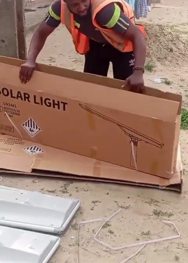 A man in an orange safety vest is unpacking a large cardboard box labeled "SOLAR LIGHT" in an outdoor setting