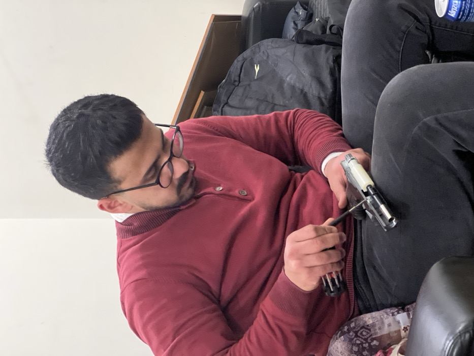 - "A man with glasses and a maroon shirt is seated, carefully using a tool to presumably clean or disassemble a silver and black handgun resting on his lap" by FM-NiDCC3, licensed under CC BY 4.0