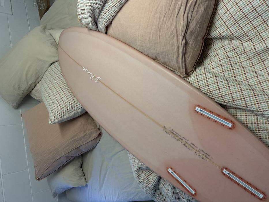A pink surfboard rests atop a bed with various neutral-toned pillows and bedding. The surfboard has four fin slots and a thin, tan line running down its center. "C. Preece" is written in white near the top of the board, and some faint handwritten text is visible near the fins. The bedding consists of white sheets, a plaid blanket, and an assortment of tan and white pillows with different textures and patterns. A small glass object sits atop a surface visible in the upper left corner.