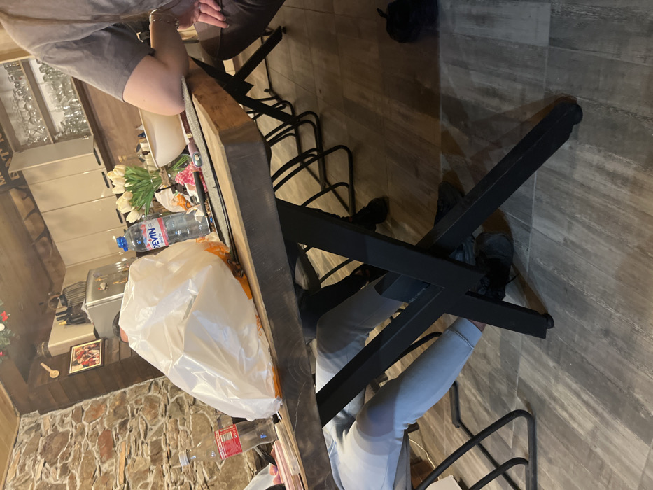 The image displays an interior scene in Novo Selo, Bulgaria, featuring a large wooden table with a thick, live-edge slab top and black metal X-shaped legs. On the table are a sizable white plastic shopping bag with orange accents, a clear "DEVIN" brand water bottle, a red-labeled beverage bottle, a clear glass vase containing white tulips, and a white bowl. Multiple individuals are present around the table. The lower legs of a person wearing light grey sweatpants and dark shoes are visible under the table on the left. The upper torso and right arm of another person, clad in a grey t-shirt and dark pants, are visible on the right side of the table. The back of a third individual's head is partially obscured by the white bag in the center. All visible individuals appear to be seated. The room's environment includes a textured stone masonry wall on the left. The background features a wooden paneled wall above white kitchen cabinets, a silver appliance, and shelves displaying clear glassware. The ceiling is made of wood, and a decorative garland is visible near the ceiling. The floor is covered with light wood-look tiles.