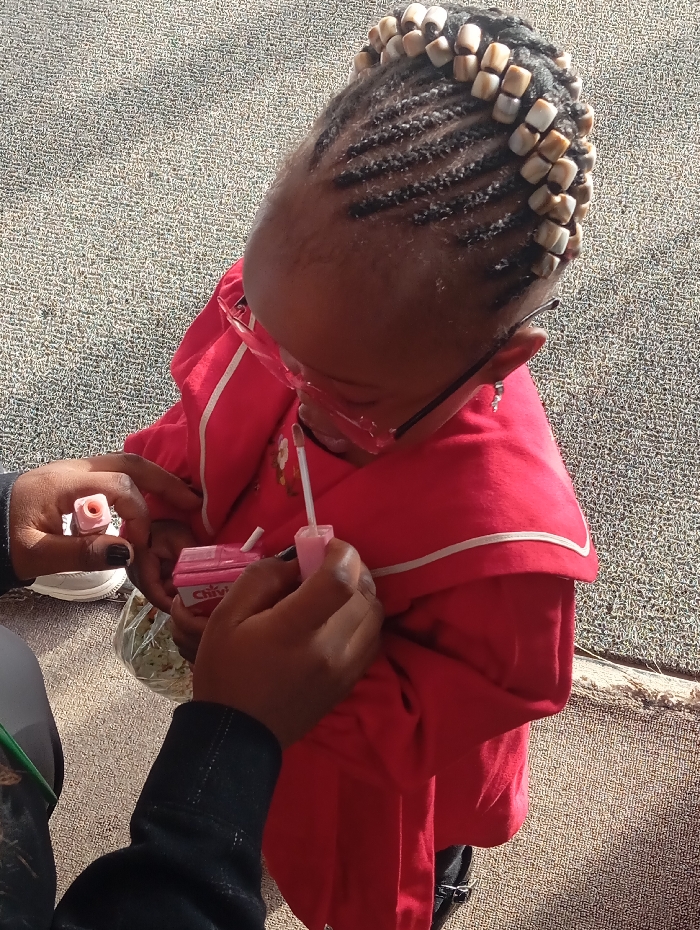 A child with braided hair and wooden beads along the hairline is looking down. Wearing red clothing and glasses, the child appears engaged in play. Two dark-skinned hands hold miniature makeup bottles, one with a wand applicator. A clear plastic bag, possibly containing food, sits nearby. The setting seems to be outdoors, on or near a carpeted surface.