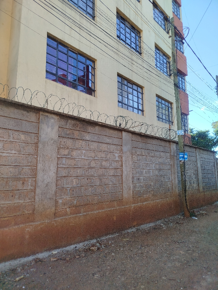 The image displays a multi-story building, likely an apartment complex, observed from an unpaved path in Nairobi, Kenya