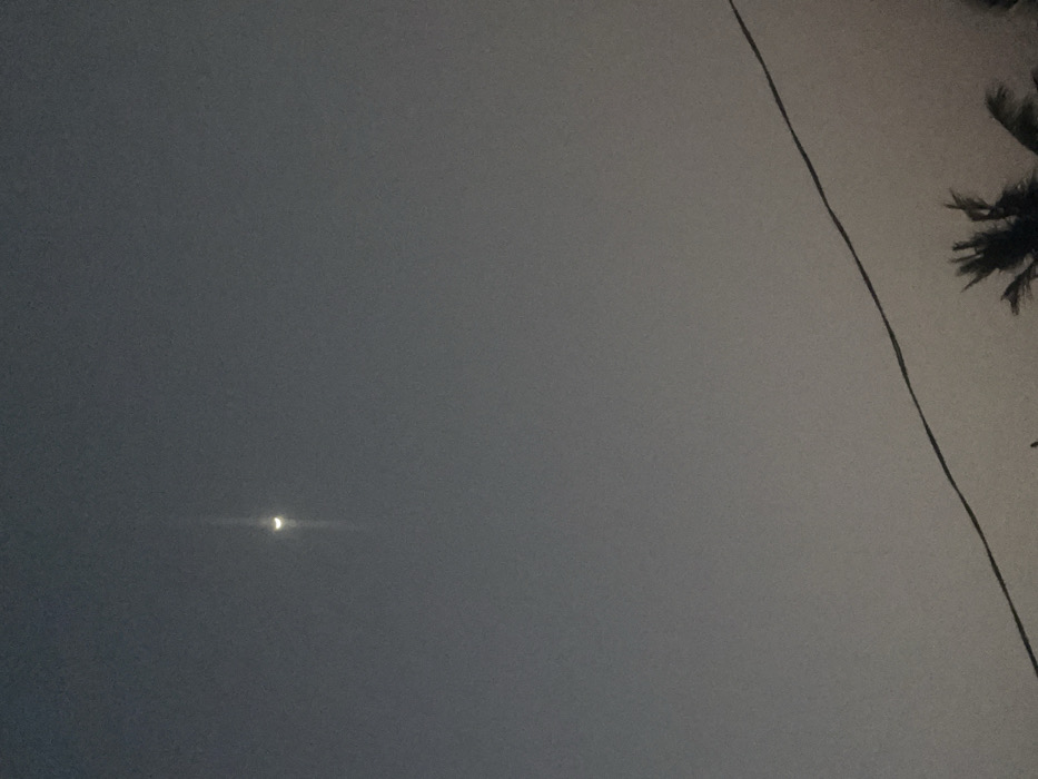 A cloudy, gray sky fills the image. A crescent moon shines faintly in the left center. A dark power line stretches diagonally from the upper right to the lower right. A palm tree, also dark, is visible in the upper right corner. The overall tone is somber and muted.