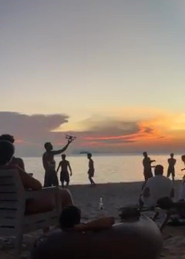 The video captures a beach scene at sunset. A man holds a small drone in his outstretched hand, its lights blinking. Other people stand nearby on the beach, silhouetted against the colorful sky and water. Some are gathered in seated groups, while others stand or walk along the shore. The sea is calm, with islands visible in the distance. The light is soft and dim, characteristic of twilight.