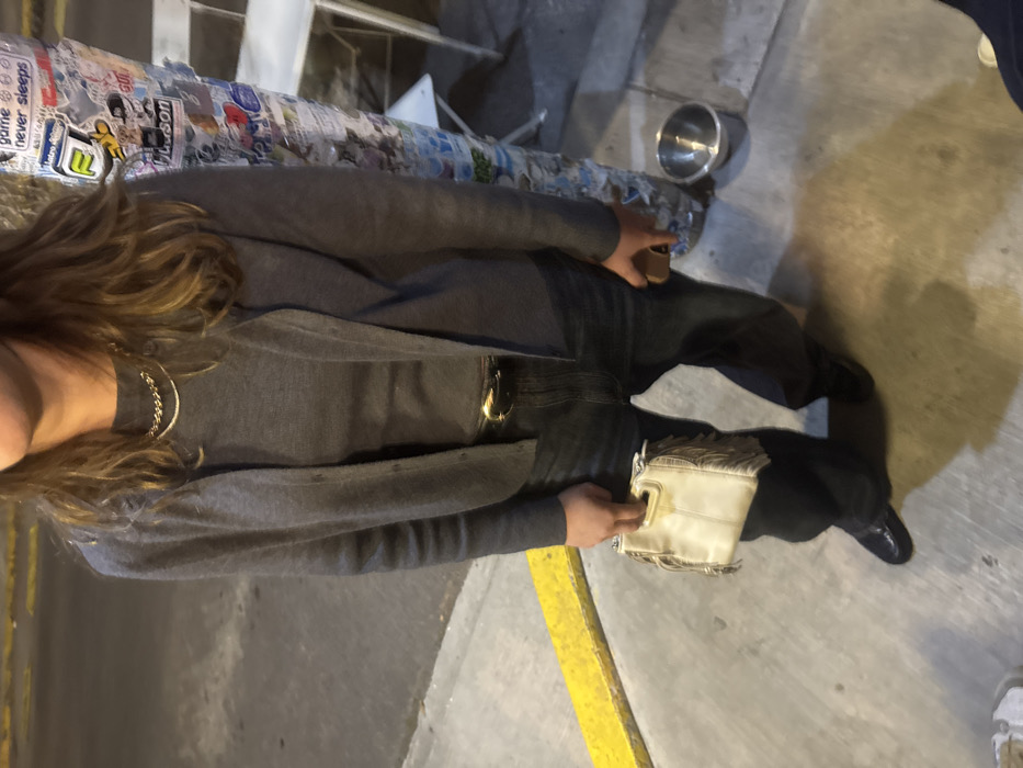 A person is seated, wearing a gray cardigan, dark jeans with a gold belt buckle, and black shoes. They hold a light-colored, fringed bag. Beside them is a cylindrical object covered in stickers. A small metal bowl rests nearby. The setting appears to be outdoors on concrete with a yellow line marking a division.