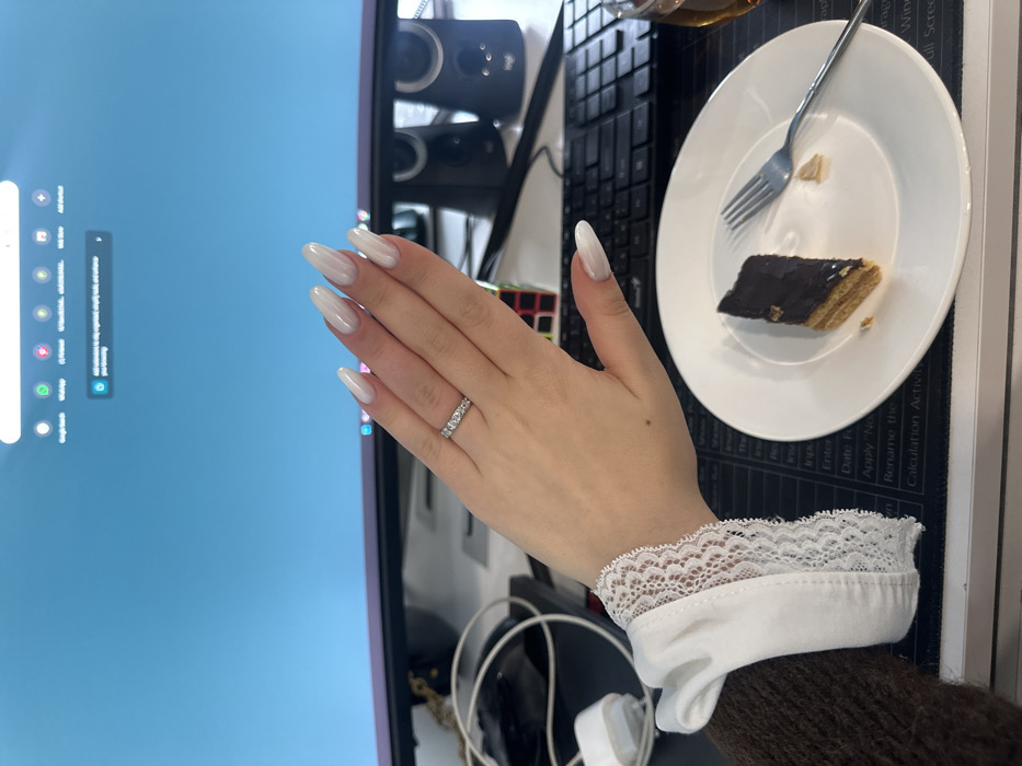 A hand with long, almond-shaped nails coated in pale white polish rests atop a desk. The ring finger sports a delicate band of diamonds. The wrist is adorned with a white, lacy cuff peeking out from a brown sweater. Next to the hand, a white plate holds a partially eaten slice of chocolate-covered cake with a fork resting alongside it. A computer monitor dominates the left side of the image, displaying a home screen with various icons. A keyboard and speakers sit near the plate, indicating a workspace.