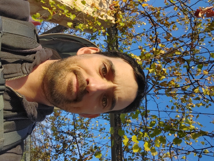- "A man with a beard, wearing a dark jacket and backpack, is seen from a low angle against a backdrop of branches and autumn foliage" by FM-3Ip2o1, licensed under CC BY 4.0