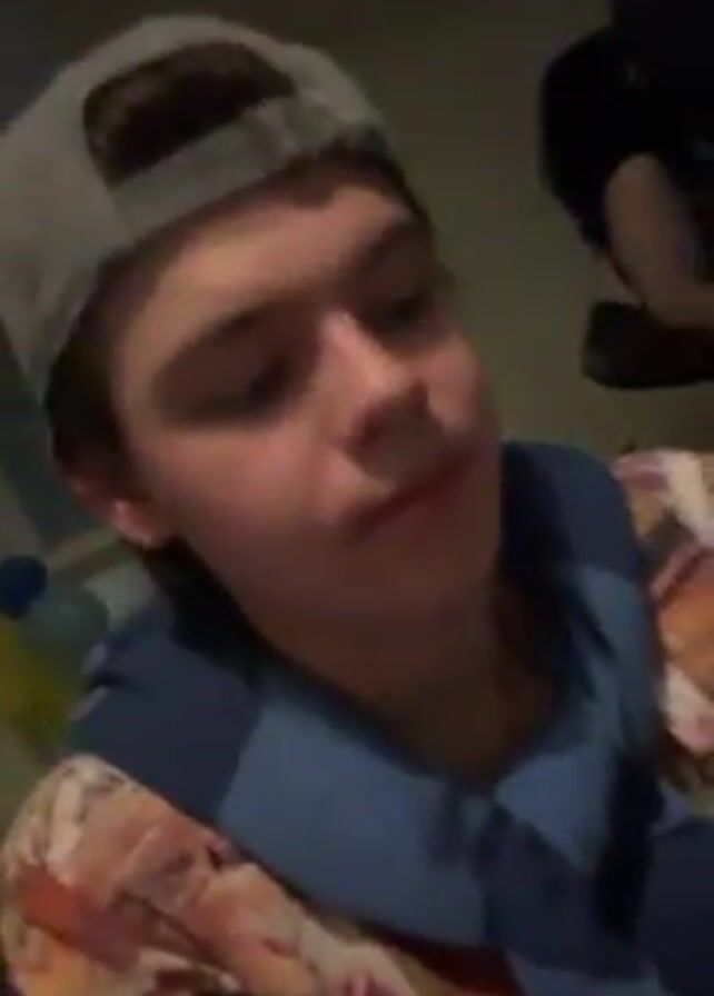 A young person wearing a blue shirt, a colorful patterned jacket, and a grey baseball cap tilted slightly backward is in a dimly lit environment with music playing. Another person is visible in the background. The camera is held close to the face of the person in the foreground. The person looks at the camera and appears to be nodding slightly.