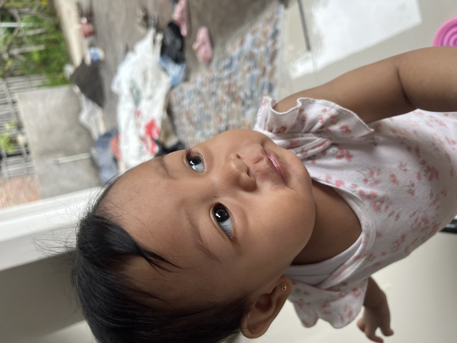A baby with dark hair and eyes is looking up at the camera. She is wearing a white shirt with a pink floral print. The baby has a small gold earring in her left ear. In the background, there are various items, including clothes and a patterned blanket. The background is blurred, indicating a shallow depth of field. The overall scene suggests a casual, indoor setting.