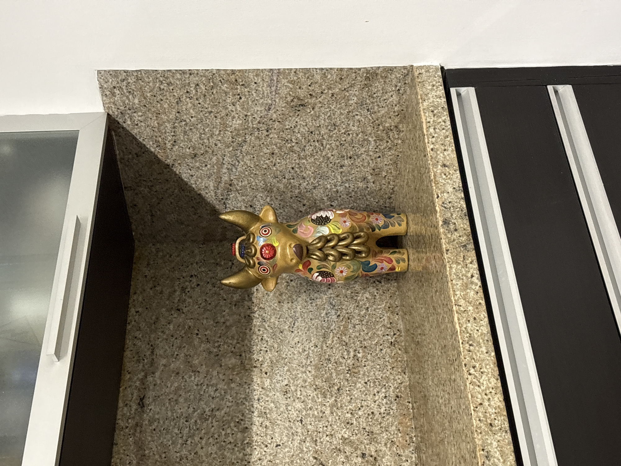 A brightly colored golden bull figurine is placed inside a niche covered with speckled stone paneling