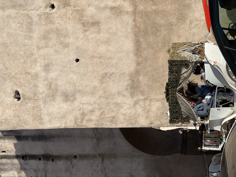 - "The image depicts a street scene in Al Machouar – Stinia, Morocco, dominated by a tall, textured, light-beige stone wall featuring multiple circular indentations, two of which contain pigeons" by FM-Gn7EC2, licensed under CC BY 4.0