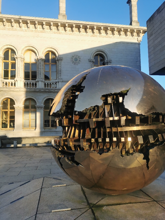 A large metallic spherical sculpture, known as "Sphere Within a Sphere" by Arnaldo Pomodoro, dominates the lower right and central foreground