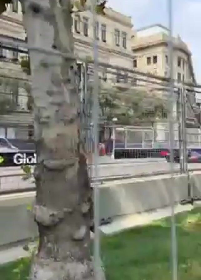 A person standing behind a chain link fence films Formula 1 race cars speeding past on a racetrack. Large commercial advertisements appear on the racetrack barriers. A tall building with balconies is visible in the background. Trees are interspersed between the fence and the building. The day appears bright and sunny.
