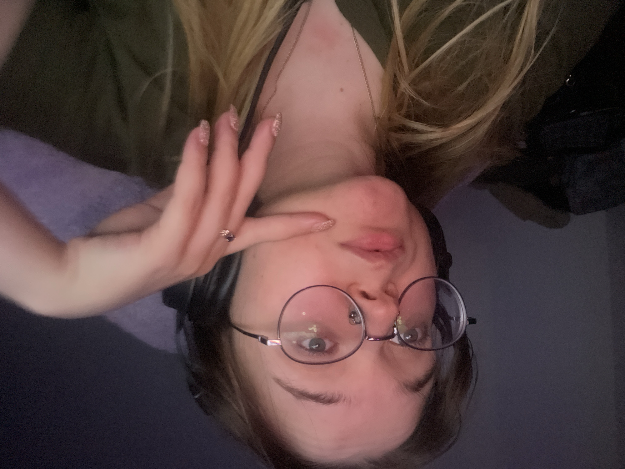 The image captures an individual indoors at an unknown location in Unknown, Unknown. The subject is a light-skinned person, appearing to be female, with light brown hair that has lighter blonde ends. They are wearing round, dark-rimmed glasses and black over-ear headphones. The individual is dressed in a dark olive-green garment and is looking directly towards the viewer. Their right hand (viewer's left), featuring glitter-polished nails and a ring with a dark, possibly purple, gemstone on the ring finger, has the index finger positioned under the chin. A thin, gold-colored chain necklace is visible around the neck. The background is dimly lit and out of focus, revealing a blurred purple object behind the subject's right shoulder. A prominent reddish light source illuminates the left side of the subject's face.